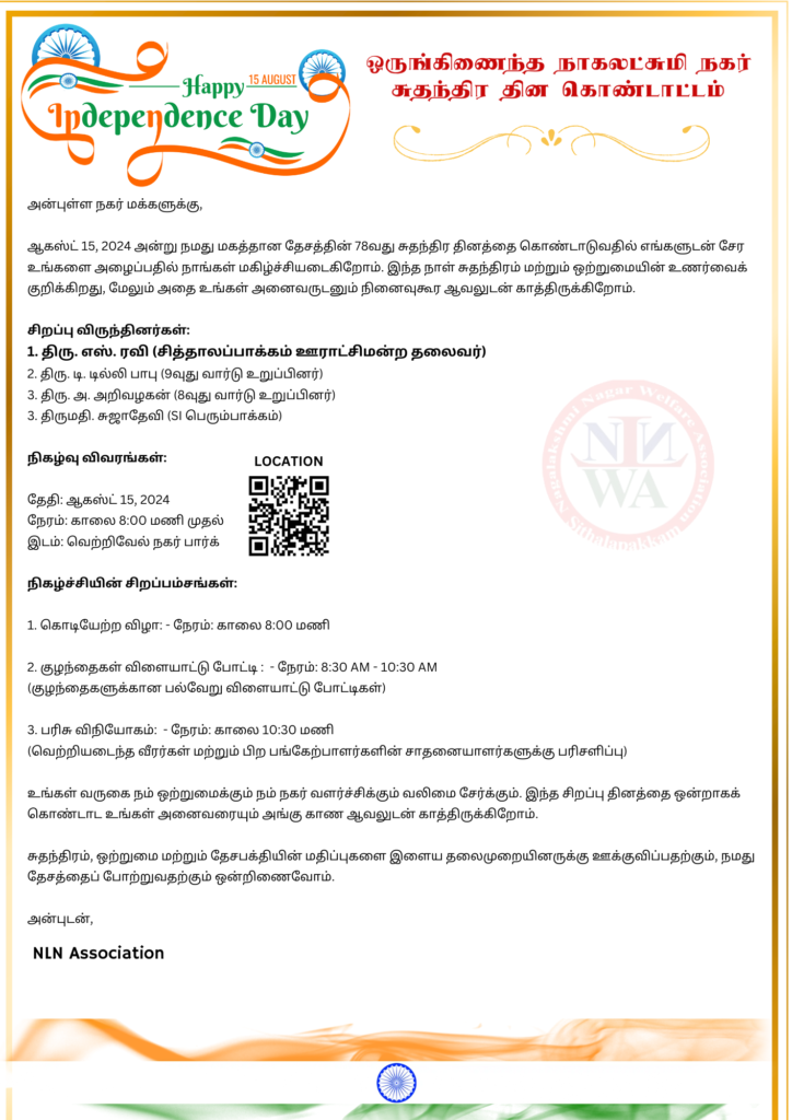 ஆகஸ்ட் 15, 2024 அன்று நமது மகத்தான தேசத்தின் 78வது சுதந்திர தினத்தை கொண்டாடுவதில் எங்களுடன் சேர உங்களை அழைப்பதில் நாங்கள் மகிழ்ச்சியடைகிறோம். இந்த நாள் சுதந்திரம் மற்றும் ஒற்றுமையின் உணர்வைக் குறிக்கிறது, மேலும் அதை உங்கள் அனைவருடனும் நினைவுகூர ஆவலுடன் காத்திருக்கிறோம்.
